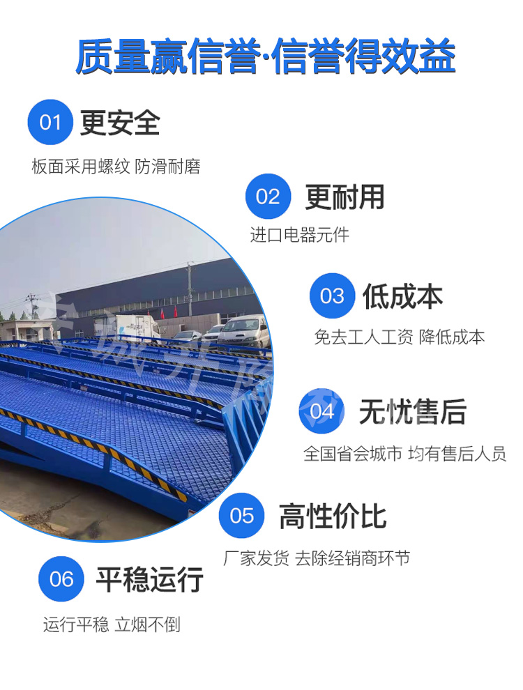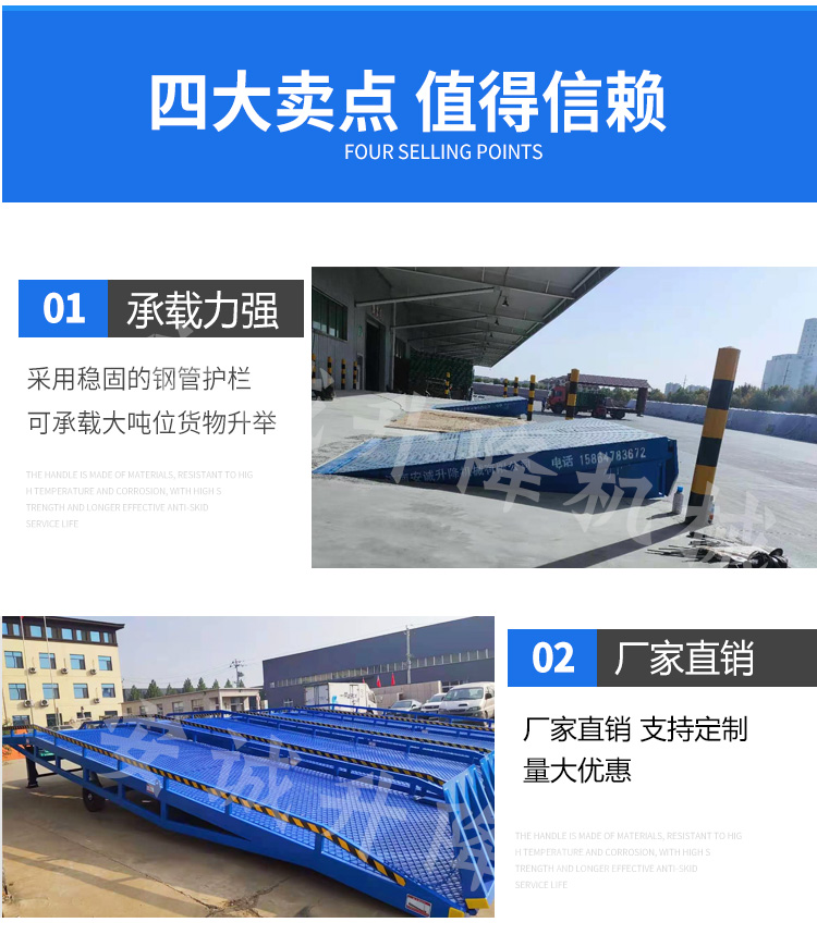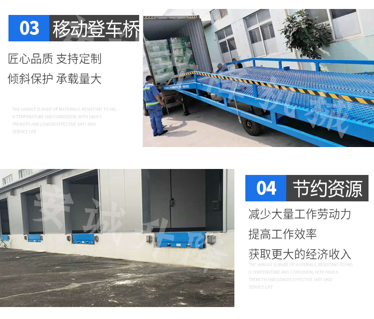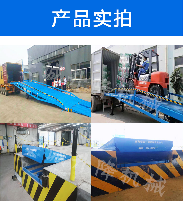 产品描述:移动登车桥只需单人操作,不需动力电源,即可实现货物的安全快速装卸,即使您减轻劳动强度,又能成倍提高装卸作业效率,加快物料流通速度,获得更大的经济效益。